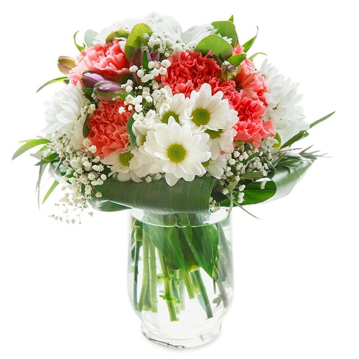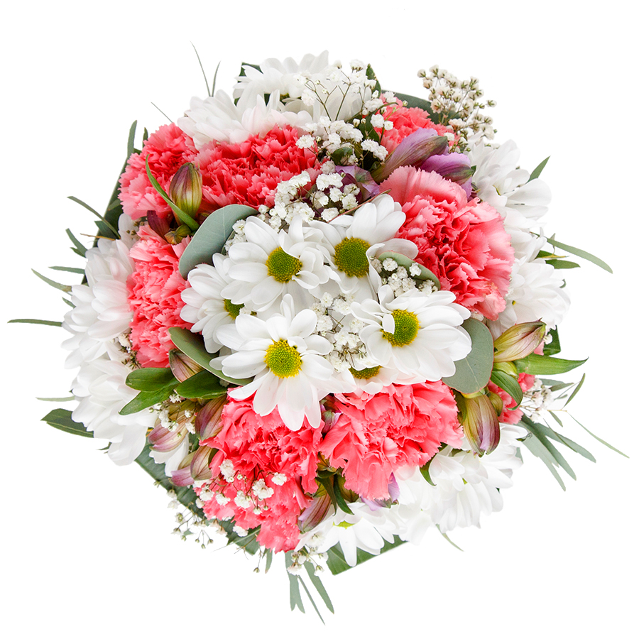 Express your sentiments with our charming and unique flower arrangement. This bouquet blends snow-white chrysanthemums, delicate gypsophila, and soft light pink carnations, artistically wrapped in lush aspidistra leaves for a stunning presentation.